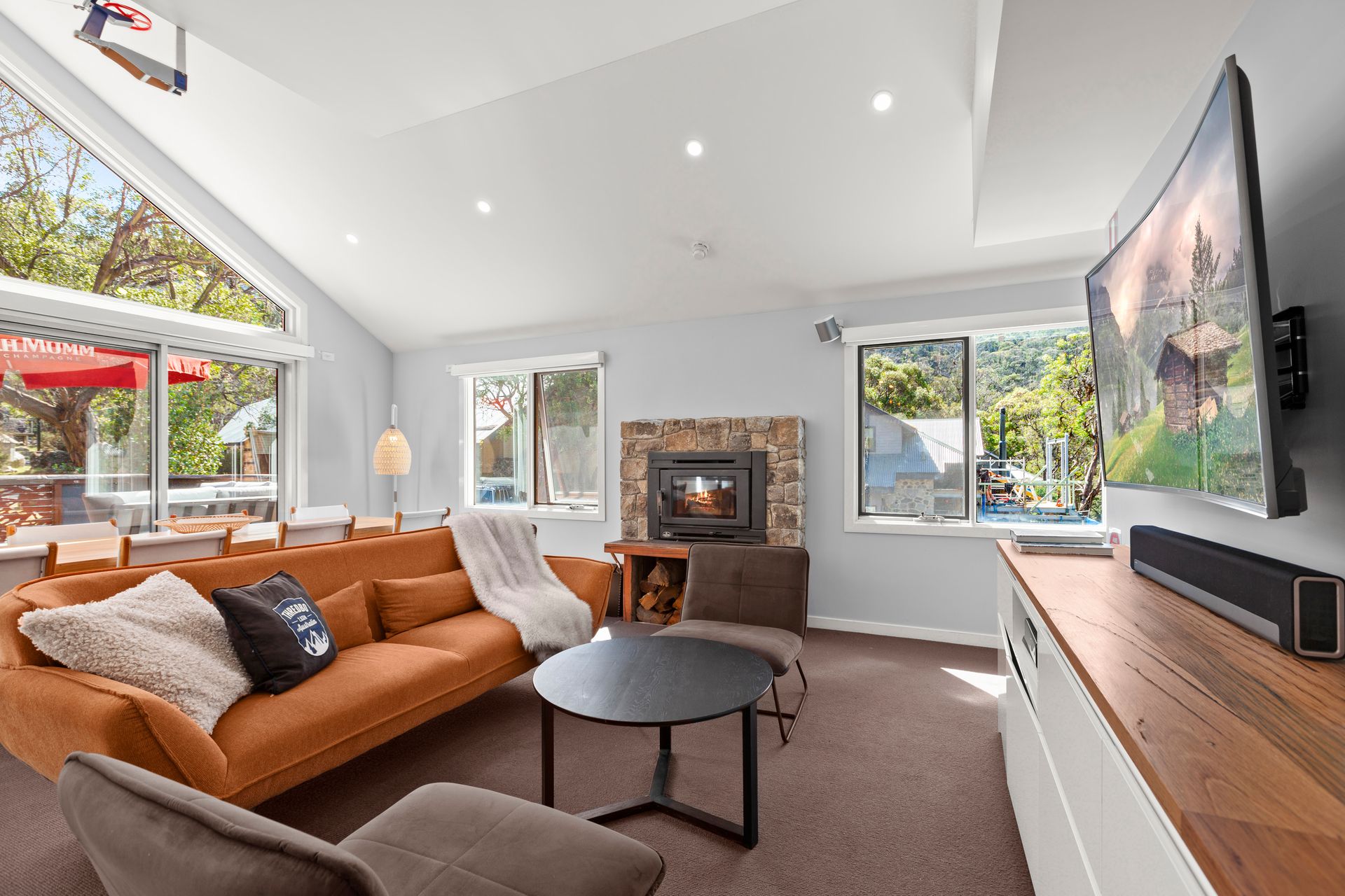 Boasting underfloor heating throughout and a cozy combustion wood fireplace, you’ll stay warm and toasty no matter the weather. Two generous living areas provide the perfect spots to gather with loved ones, whether it’s movie night, game time, or simply soaking up the serene mountain atmosphere.