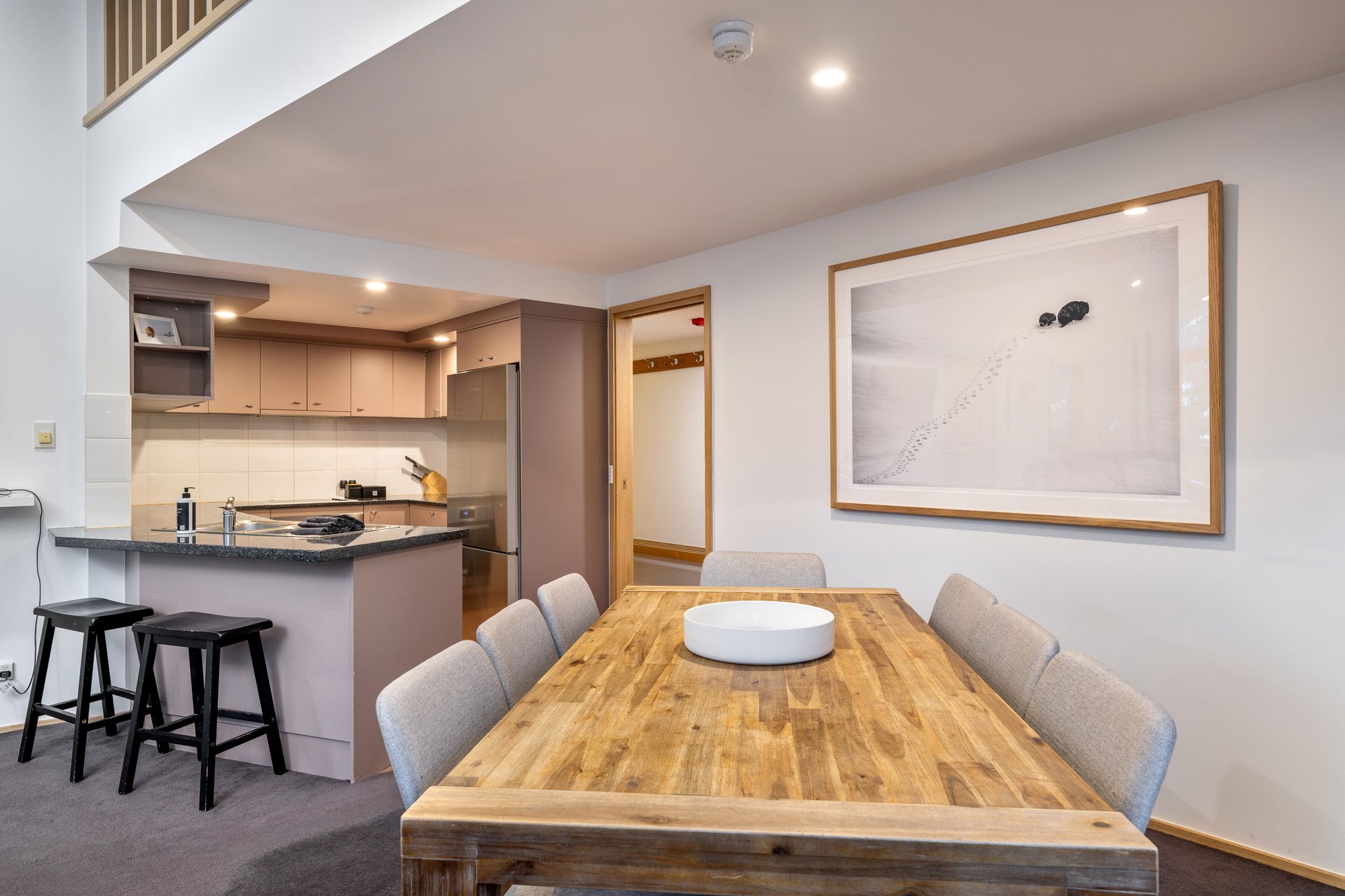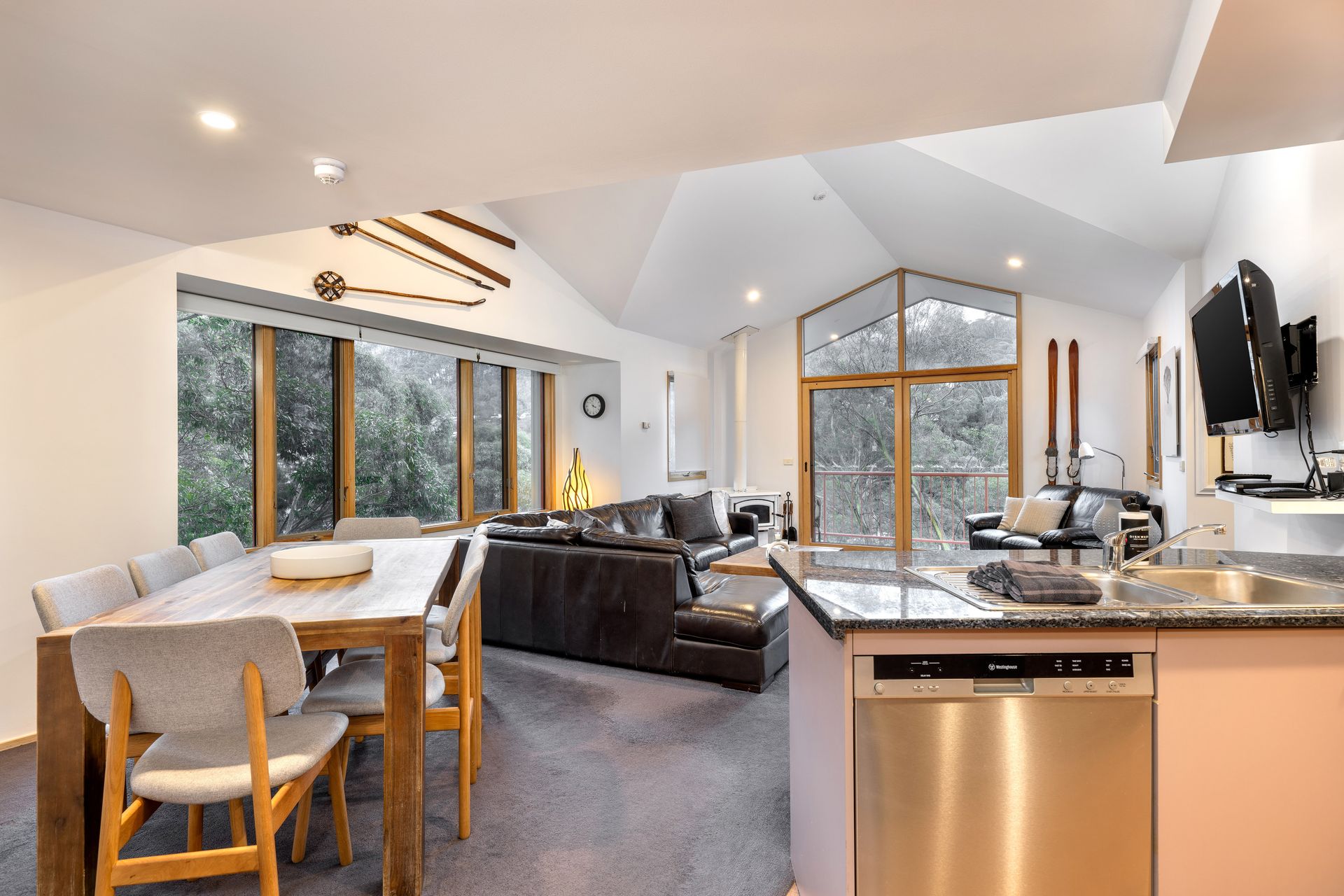 Lhotsky 4 is an open plan 3 bedroom + loft apartment with private balconies wrapping around this cosy chalet, it has a weber BBQ, wood burning fire and spectacular mountain views. The loft is suitable only for younger children as a play area as it has a low ceiling.